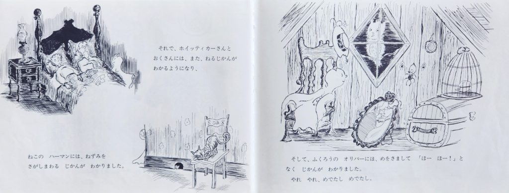 ジョージ―が移った、グロームズさんの家では、牛小屋で暮らすたいへんな目にもあいました。雪も降り、ふきっさらしの牛小屋は、とても寒く、居心地がよくありませんでした。ねこのハーマンが、ホイッティカーさんの家の階段とドアの変化に気がつきました。ハーマンは、ふくろうのオリバーに知らせ、オリバーがジョージーに伝えたのでした。ほんとうに、「やれ やれ、めでたし めでたし」のオリバーでした。