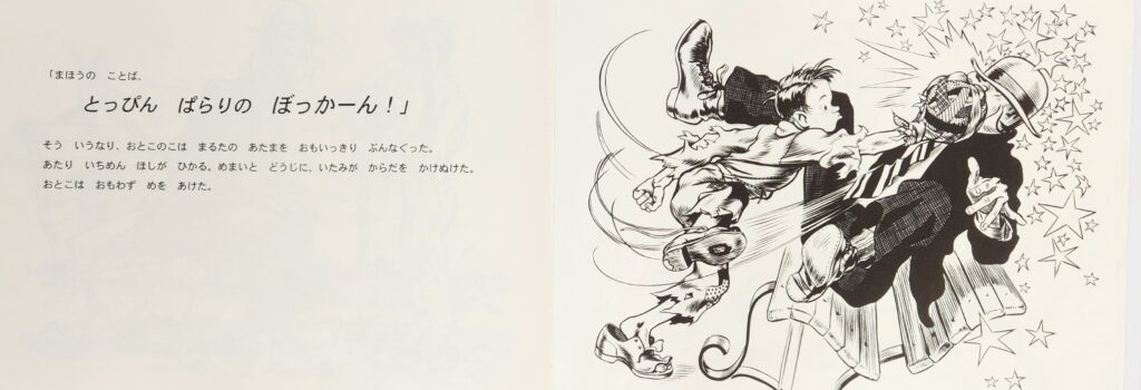 『あたまをなくしたおとこ』も、こうした作品と同様に、奇想天外なストーリーですが、疎外感やアイデンティティ・人間関係の喪失といった悲劇よりも、ユーモアと笑いが際立っています。おとこは、あたまをなくしても、カボチャやニンジンを頭にして、祭りに出かけています。周りの人物たちは、おとこを誹ったりしていません。また、おとこの顔の造作を説明するくだりは、つみあげ唄のような、男とおとこの子のリズミカルな会話で描かれています。おとこの子のパンチで、夢から目がさめるというオチもありました。