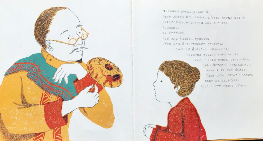 伝統的な花とチョウの絵柄にとらわれることなく、描きたいものを描き、絵つけをしたヌット。「この子は こころから 絵をつけた」と王さまはヌットを評価しました。ヌットが描いたゾウの絵は、あたらしい傘の絵柄になることと思います。伝統は、こうして革新されていくのでしょう。