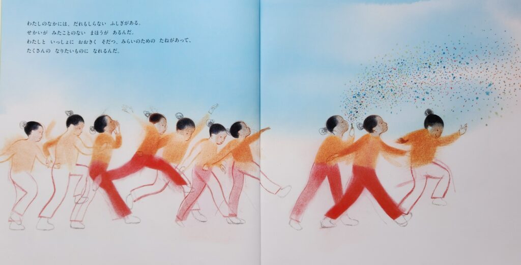 さまざまな自然を引き合いにして、「わたしとはなにか」に気づいていく少女のすがたをえがいた詩です。自分を肯定することばのあと、「でも、これだけじゃない」と屈折しながら、「わたし」への考察を深めていきます。そして、「わたしと いっしょに おおきく そだつ、みらいのための たねがあって たくさんの なりたいものに なれるんだ」と、自分の可能性を信じています。だれもが、こうあってほしい世界。作家の見たい世界を描いています。