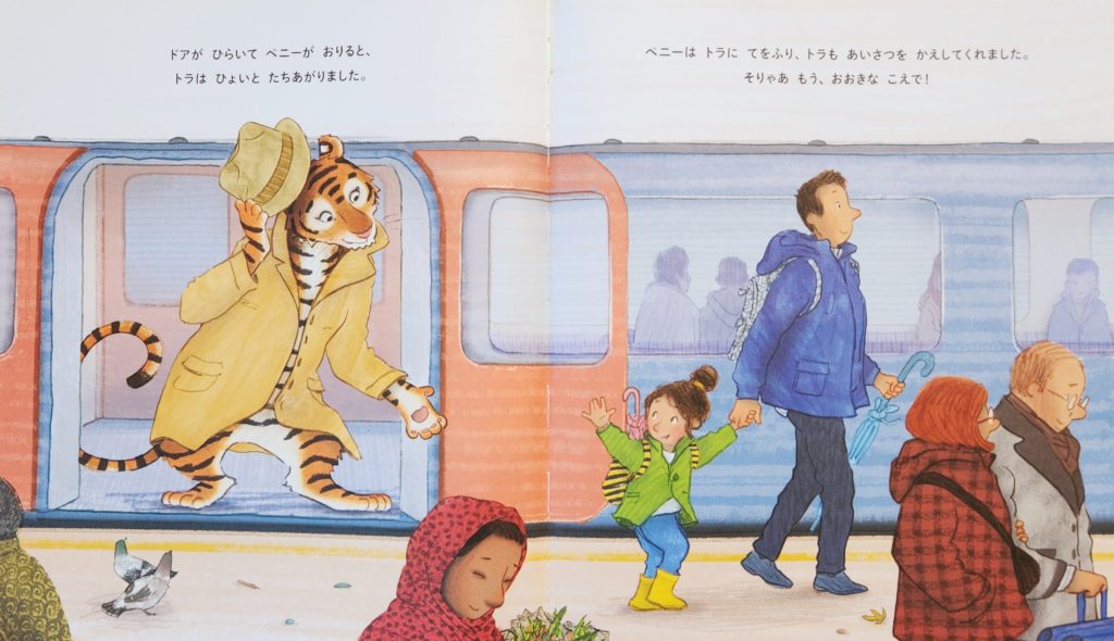 トラが、帽子をかぶり、トレンチコートを着て、新聞を読みながら、電車にすわっています。でも、誰も気づいていません。ぺにーだけが気づいています。ペニーだけが見えている世界です。常識から見れば、ありえない出来事です。おはなしだからできることですが、作者は、子どもだけが見えている世界がある、と言っているようでもあります。