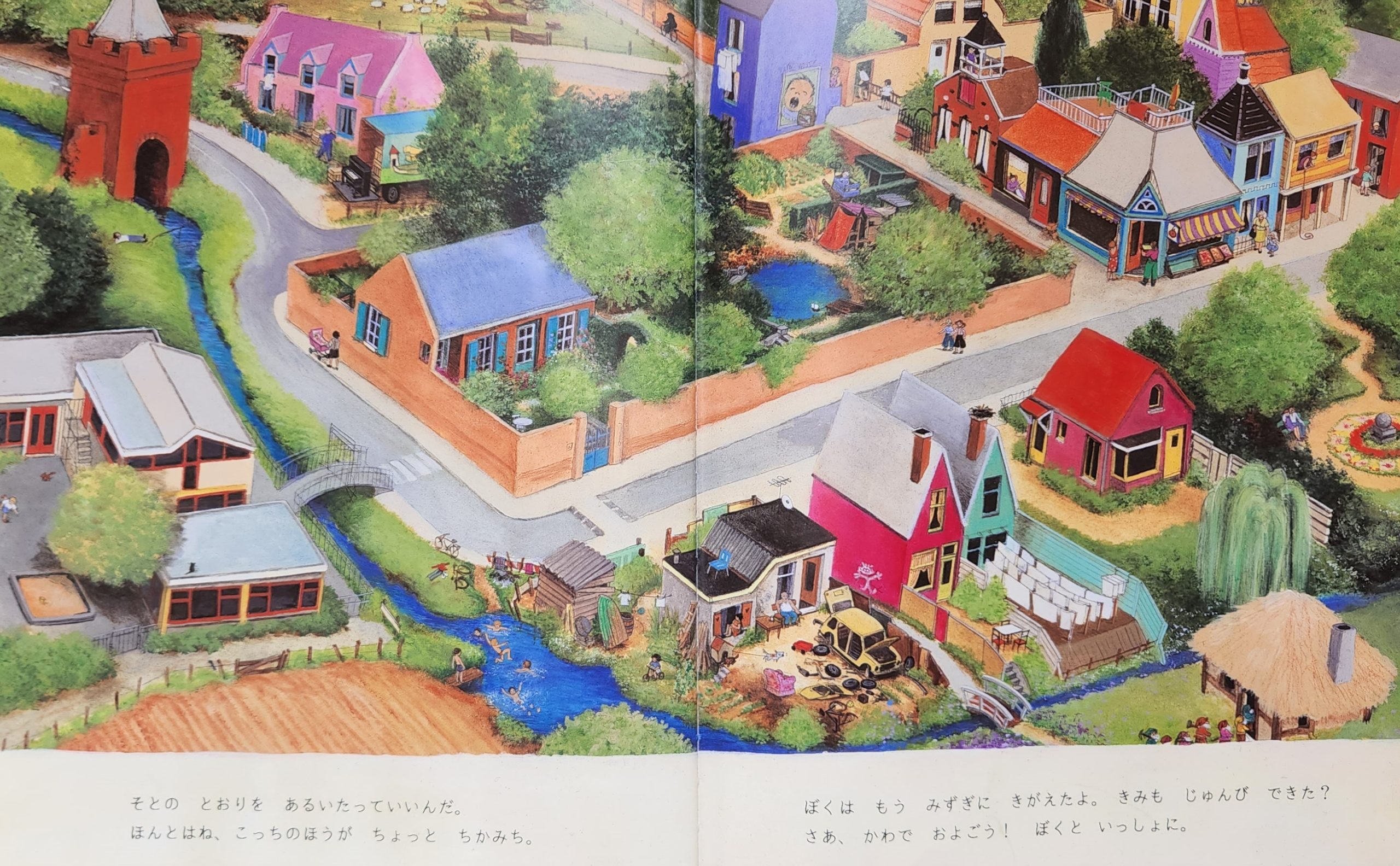 俯瞰された町の様子の絵があります。絵は、おはなしを外から客観的にみるように導きます。いっぽう、ドラゴンや海賊の場面などはクローズアップの絵です。絵の構成も、読者の体験を複雑にする仕掛けです。オランダのロングセラー絵本です。