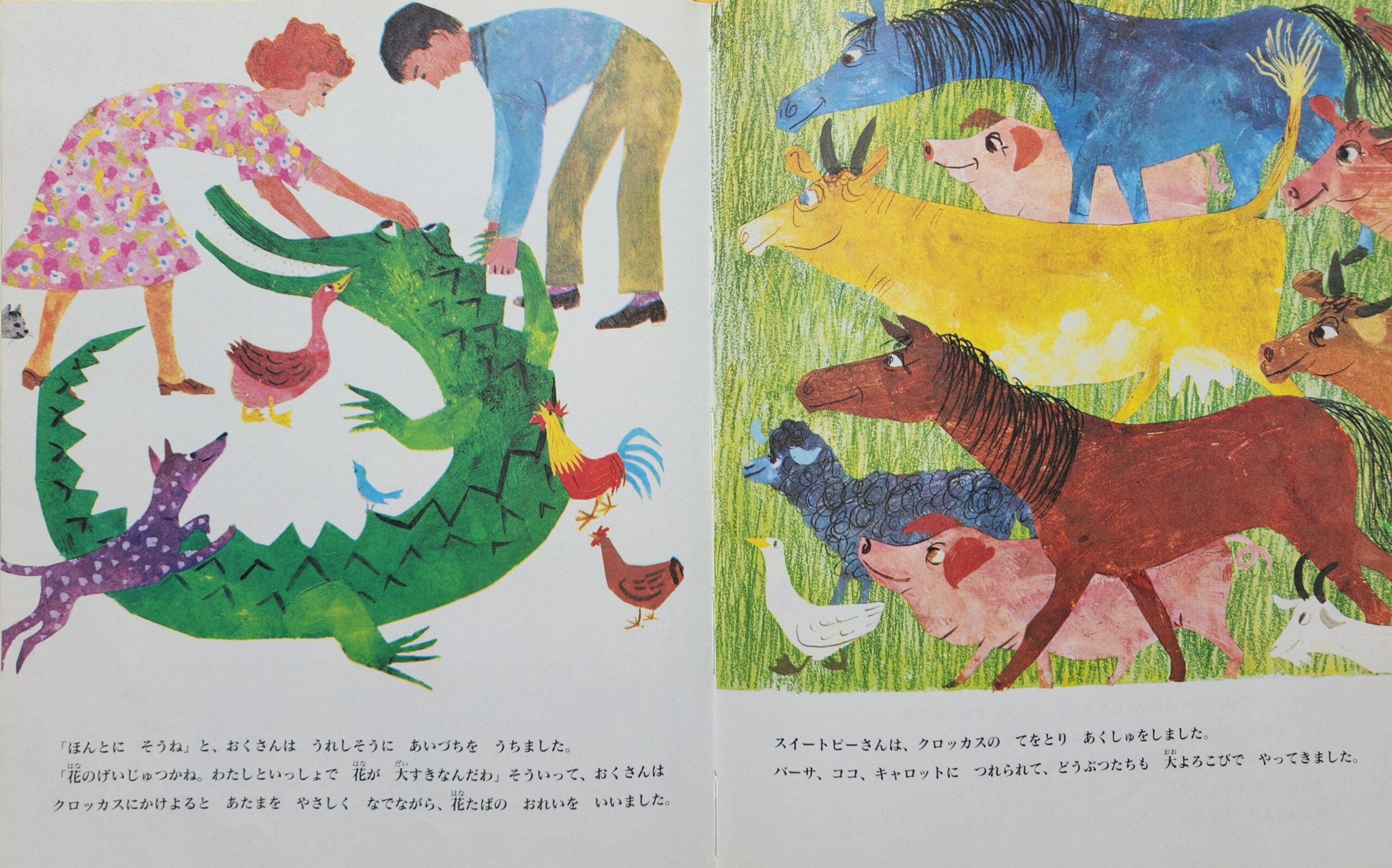 奥さんに見つかるまでが前半、後半は「むねが いたむよ おくさんを あんなに こわがらせてしまってさ」から花束をおくり、パンプキン農場に住むことになります。また、『ワニのクロッカス なにができる?』で、ワニのクロッカスは、自分だけができる農場での仕事をみつけます。次回、紹介します。