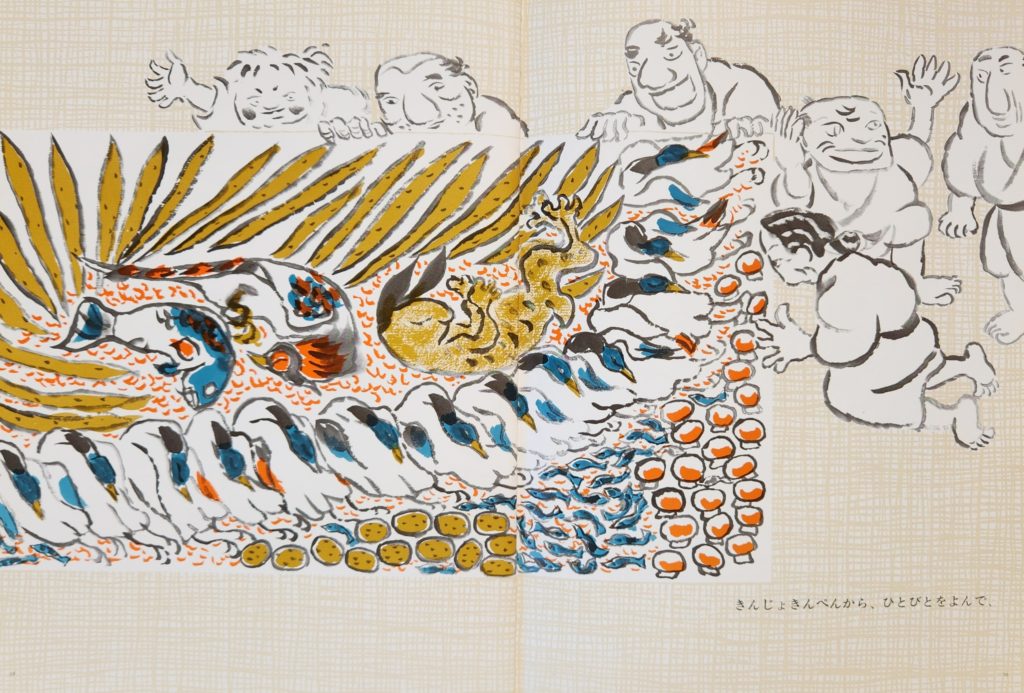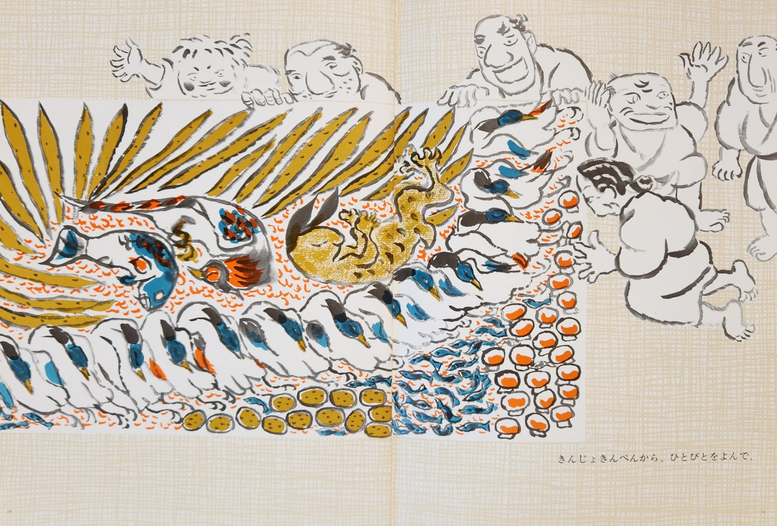 12羽のかも、15本の山芋、13個のたまご、33びきの鮒と、数に対する語り手の意識は、昔話に特徴のひとつです。また、オノマトペもいっぱいです。ガチン、すたすた、ぎしゃぎしゃ、ドガン、ばたばた、ぴしゃん、ずしりずしり、ごしゃごしゃ。オノマトペが、おはなしに彩りを添えています。