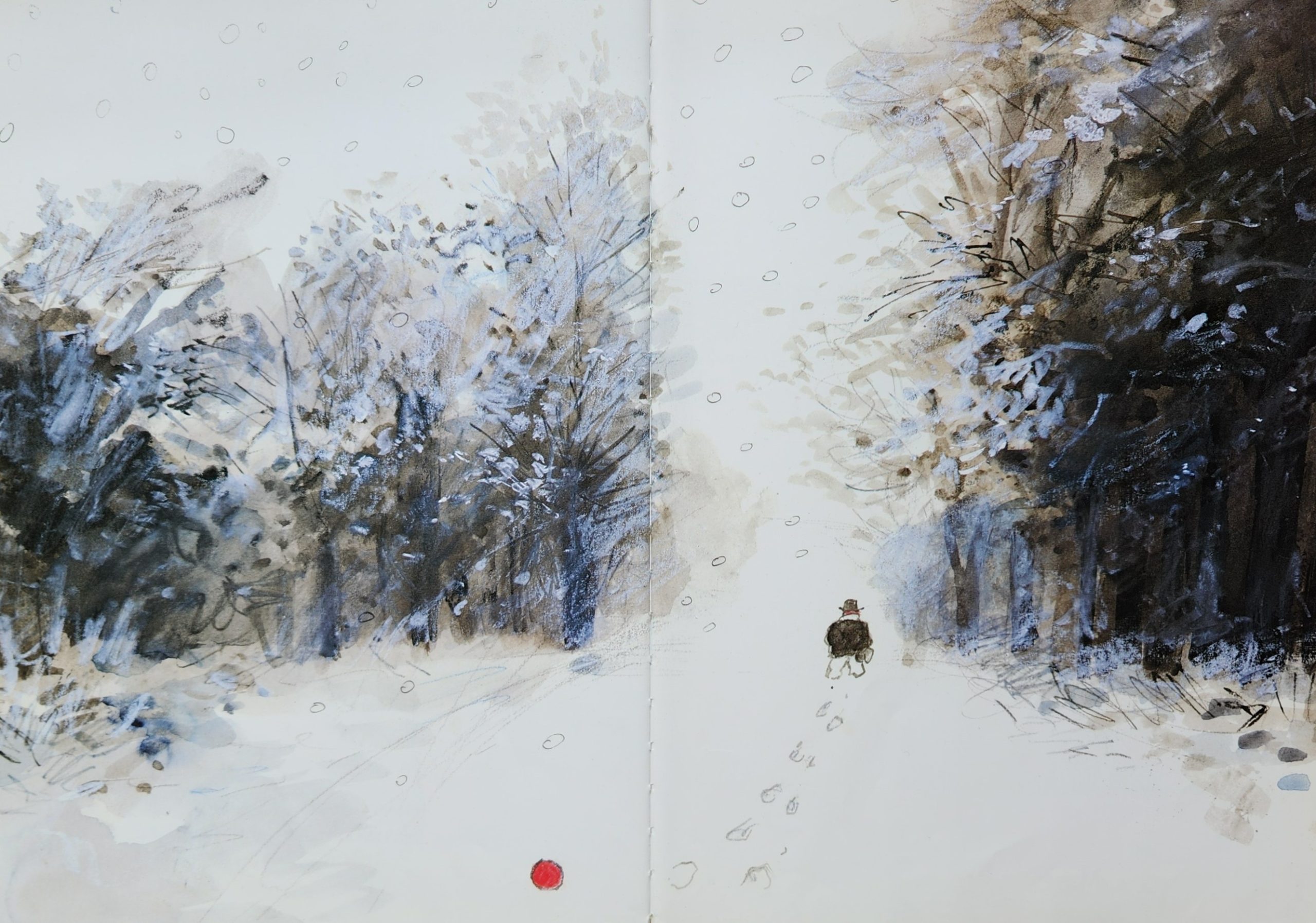 赤い鼻も白い化粧も取れなかったピエロのデューク。かれがオレゴンに着いたことは、終わりではなく、あたらしい自分の旅のはじまりでした。最後の場面は、雪の森のなかを歩いていく、デュークの後ろ向きのすがたが描かれています。