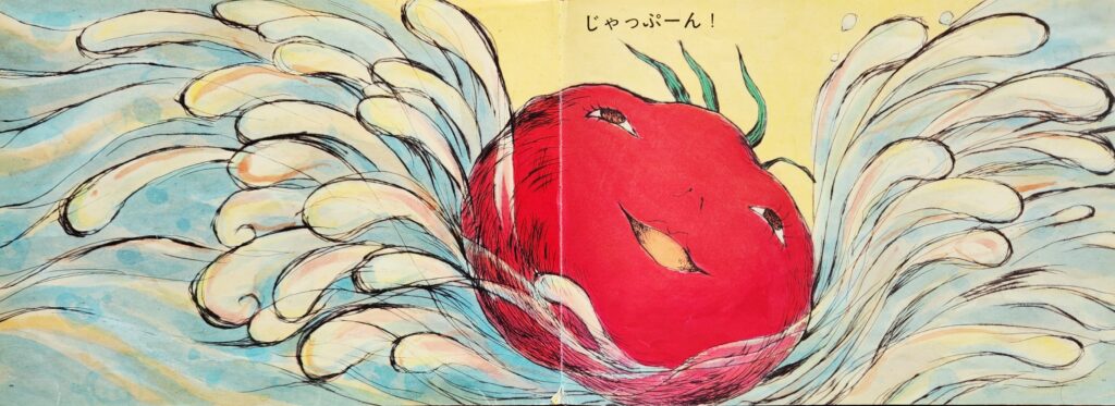 じゃっぽーんと水の中に入ったトマトさんの満足そうな顔は見どころです(上の絵)。子どもたちも、こころから満足して遊ぶ時、トマトさんと同じような表情を見せることでしょう。トマトさんは、子どもの姿、そのものです。
