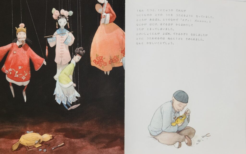 ほんもののナイチンゲールと、作り物の鳥が対比されています。みんな、はじめ宝石のきらめく作り物の鳥に夢中になりましたが、歯車がからまわりして、うたわせるのは、年に1度ときめられました。