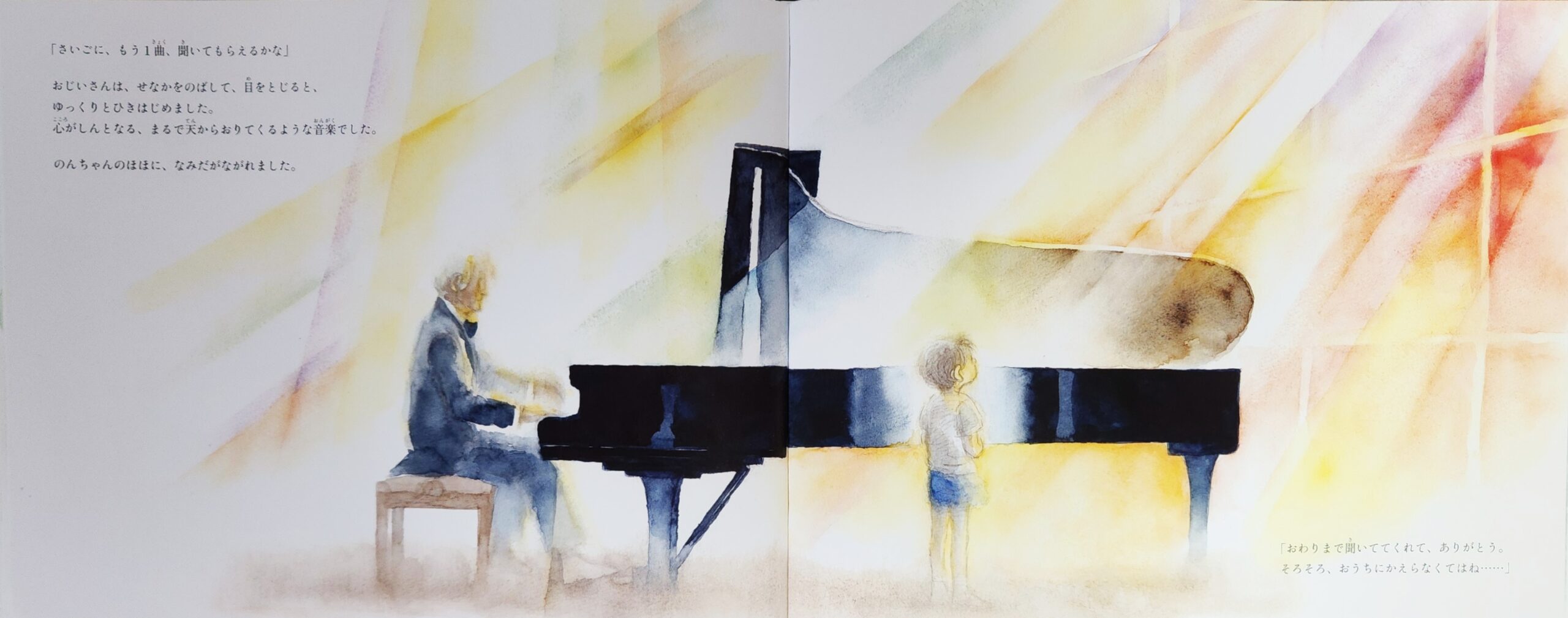 のんちゃんの喪失感を癒すような、おじいさんのピアノの調べです。おじいさんのピアノ、おとうさんのヴァイオリンを追いかけて、のんちゃんどのどのような音楽をはじめるのでしょうか。のんちゃんのあたらしい生活に希望が感じられる終わり方です。