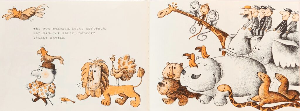 飼育係になったマスターさんは、このあとどうなったのでしょうか。たのしい動物園生活がはじまりそうです。『どうぶつえんのピクニック』という続編があります。動物園のどうぶつたちが、ピクニックに出かけることになりました。飼育係のマスターさんは、お弁当をつくり、バスを貸し切ります。でも、案の定、大騒動がおこります。