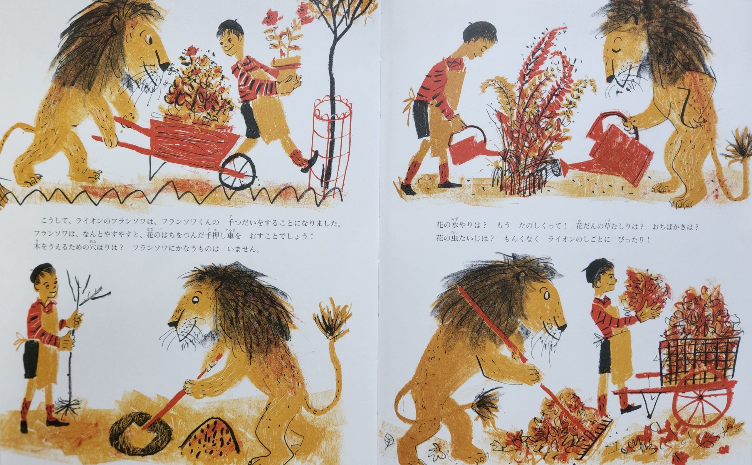 「三びきだと二ひきよりももっとごきげん」という気持ちの、ごきげんなライオンと ごきげんなライオンのおくさん。愛情豊かに育てられたフランソワ。ペットのライオンにも、サーカスのライオンにもなれませんでしたが、さいごに動物園に戻り、庭師になりました。庭師のむすこ・フランソワ君の仕事を小さい頃からずつとみていて、庭師の仕事が 好きだったのです。やりたいことをするのがしあわせです。それを見まもっいているごきげんなライオンとおくさんも、しあわせなきもちでした。